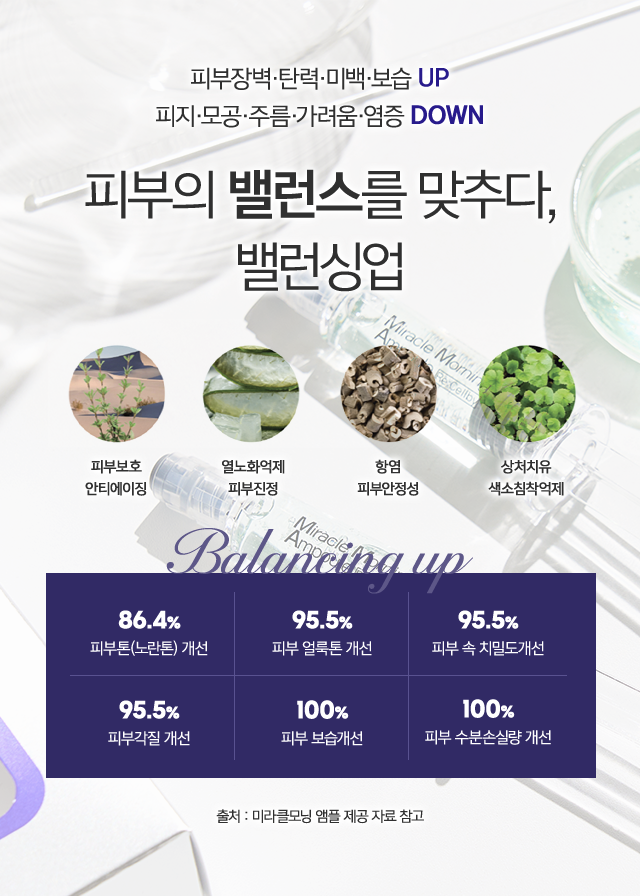 밸런싱업 약침과 병행되는 미라클모닝앰플은 로즈줄기세포 엑소좀(ExoBRID-R)이 주 성분으로 피부장벽강화, 미백강화, 콜라겐합성능력 증가에 도움이 됩니다. 부원료인 수딩쿨러(Soothing Cooler®)원료는 진정 특허 성분으로 붉은기, 민감한 피부의 진정을 기대하기 좋으며, 병풀추출물을 추가하여 상처치유와 색소침착억제에 도움이 됩니다. 저자극테스트 완료, 8가지 인체적용테스트 완료로 피부 개선의 효과를 입증했습니다.